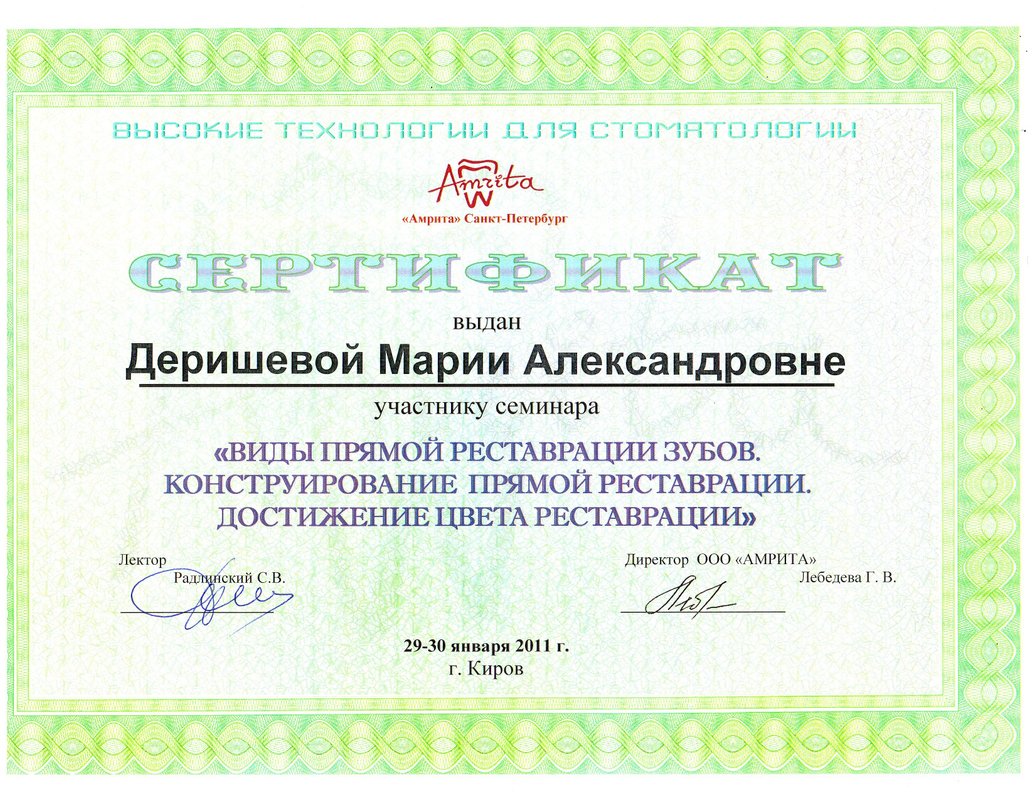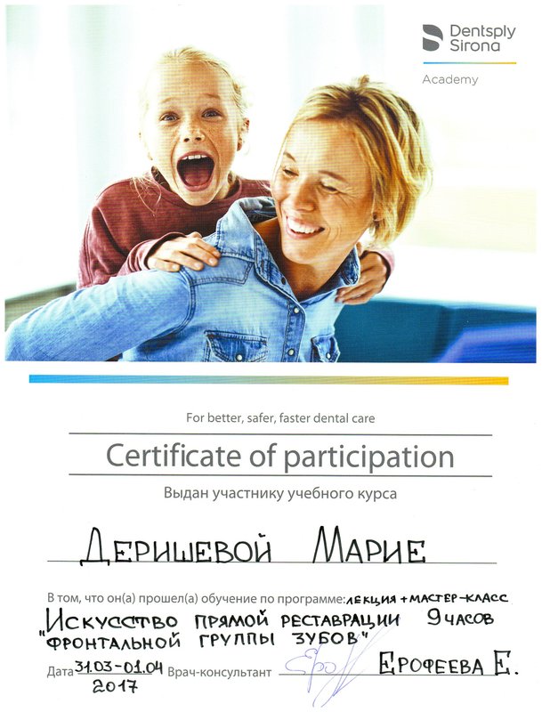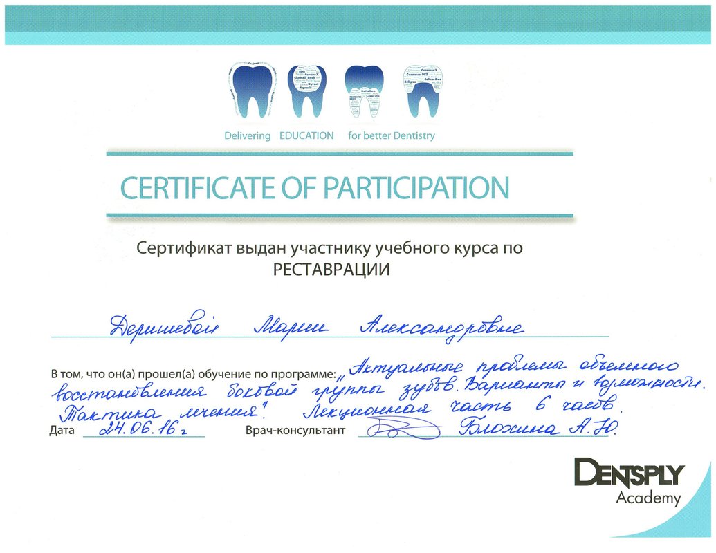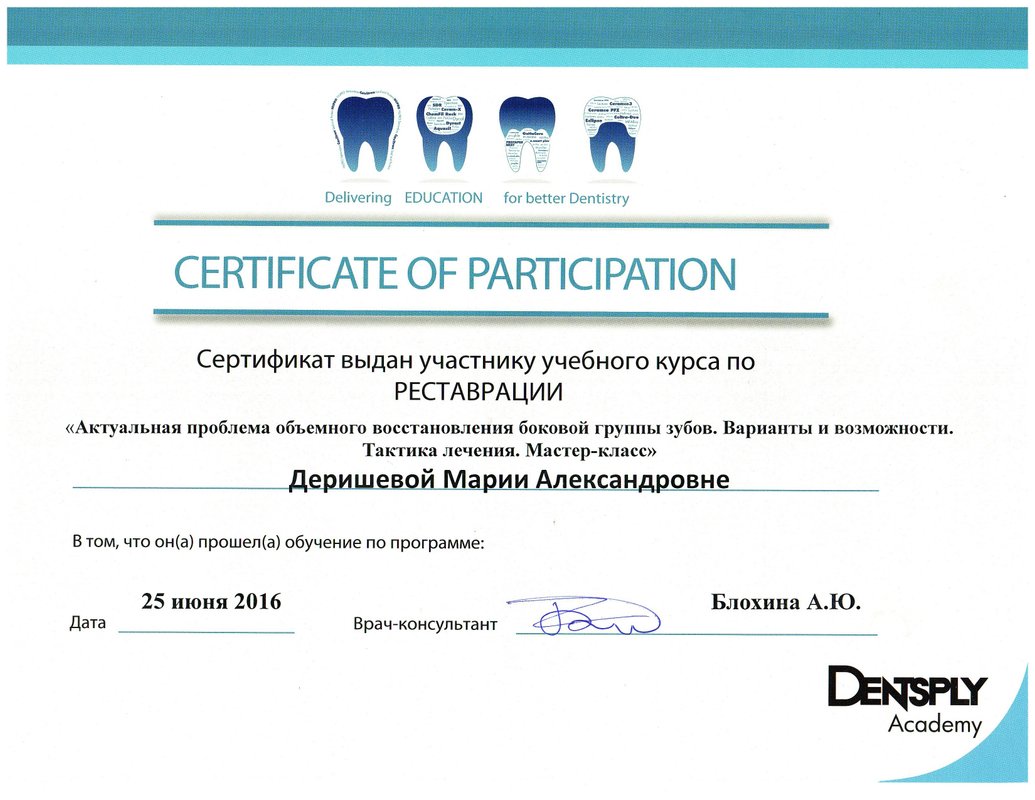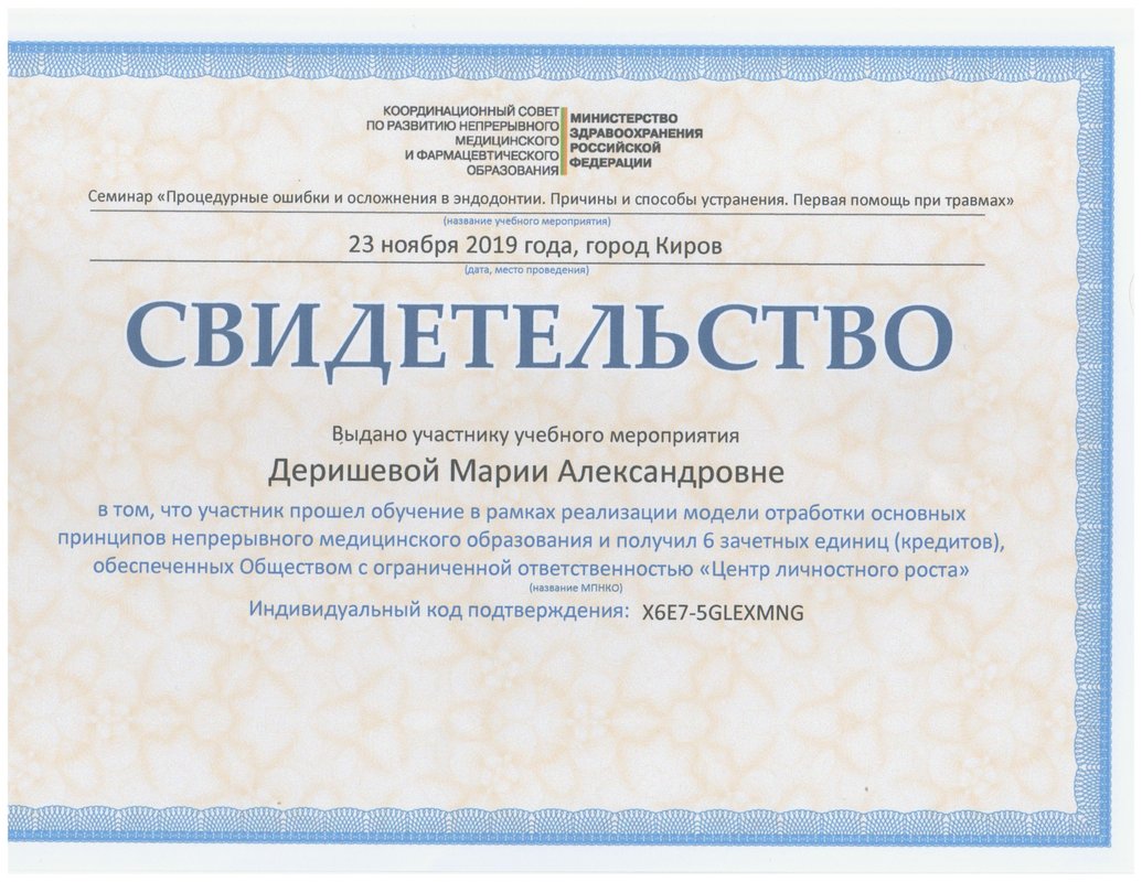 Я очень хорошо знаю Марию Александровну Деришевау, поэтому хожу к ней на лечение. Она работает очень аккуратно, безболезненно и быстро. И после лечения у меня не возникает никаких болезненных ощущений. Она лечила мне пульпит, кариес и все очень хорошо сделала. Сама клиника тоже хорошая, чистая. Администраторы быстро записывают на прием, долго ждать не приходится.